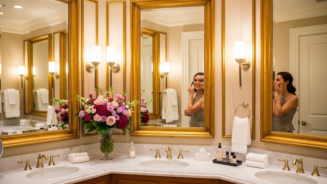 For your guests, this signals that you value their comfort. It allows them to freshen up in a spacious, clean, and well-lit environment. There are full-sized vanity mirrors for checking makeup, ample space to move around without ruining delicate clothing, and high-end toiletries that add a touch of spa-like indulgence.
